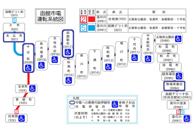 「谷地頭」までを結ぶ2系統の2路線あります。「湯の川」から「十字街」までは
