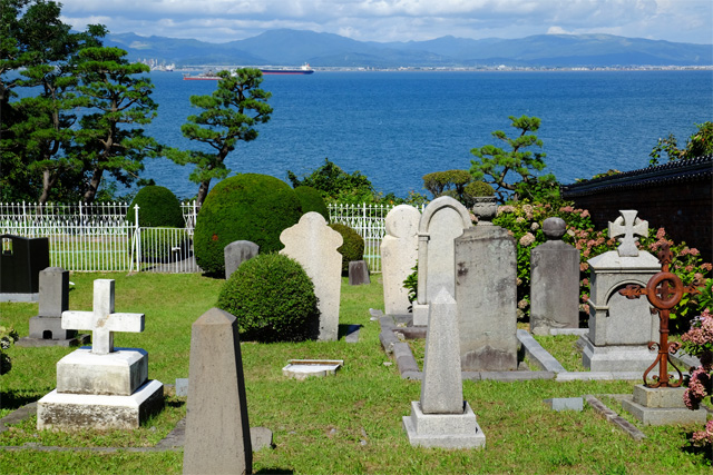 5系統の終点「函館どつく前」電停から徒歩約12分の位置にあります。1854(安政元)年 のペリー来航時に亡くなった2人の水兵を埋葬したことが始まりとされ、その後、帰国 がかなわず異国の地で亡くなった領事や商人、海兵などがこの地で眠っています。海を 望むように造られ、函館港や駒ヶ岳を望める景勝地としても有名で、海側に整備された 散策路から絶景を眺めることができます。