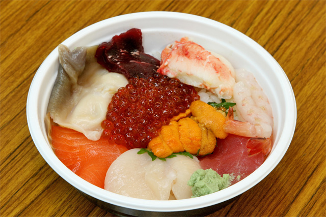 白いご飯の上に新鮮な海鮮を好き勝手に自分で乗せて自由に作る「勝手丼」スタイルの海鮮丼は、 今や道内の多くのホテルの朝食などで提供されて人気になっていますが、実は釧路が元祖です。 「釧路和商市場」で夏に訪れるライダーたちに魚介の切り身を安く提供したのが始まりで、 現在では釧路名物として多くの観光客に人気です。