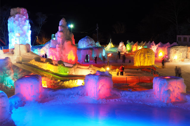 支笏湖畔に色とりどりに輝く氷のモニュメントが作られ、夜にはライトアップで幻想的な世界が演出されます。