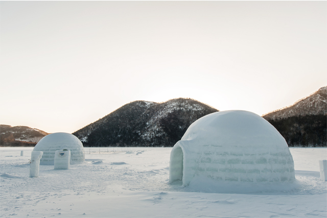 「然別湖」が完全に凍った氷上は、一面が真っ白な世界で、 この凍った湖上に1月の末からわずか60日間だけ幻の村が現れます。 村の建物は全てが氷と雪だけで作られていますので、春になり暖かくなると全部とけて無くなってしまいます。 アイヌ語で村を意味する「コタン」と名付けられた「しかりべつ湖コタン」では 冬の時期にしかできないオンリーワンの特別な体験が楽しめます。