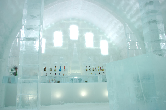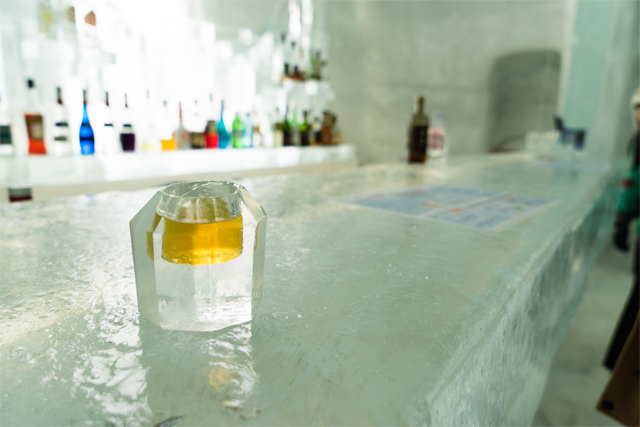 透明度の高い美しい湖から切り出した透明な氷でできたブロックを一個ずつ積み上げて造られたアイスバーは、 言葉では言い表せないほどの美しさです。 色とりどりのボトルが更にバーを煌びやかに彩ります。