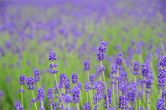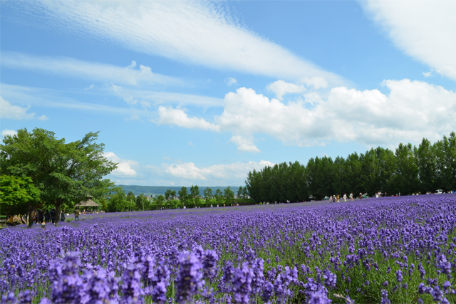 ラベンダーのベストシーズンは7月中旬から下旬、香り豊かで一面、紫色に咲き誇ります。 ファーム富田ではラベンダーようてい、ラベンダー濃紫早咲、ラベンダーおかむらさき、 ラベンダーはなもいわ、ラバンジン等、早咲き、遅咲きなど、8種類のラベンダーが栽培されており、 6月下旬~8月中旬までラベンダーを楽しむことができます。 畑には名前が付けられており、トラディショナルラベンダー畑、森のラベンダー畑、 倖の畑にそれぞれの時期にあわせて見事なラベンダーが咲き乱れます。