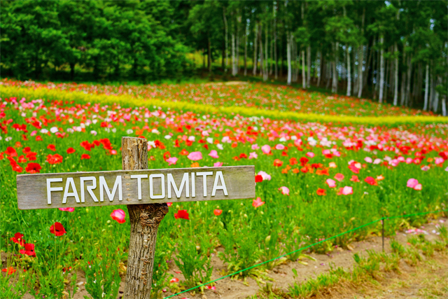 一番の人気はやはり、ラベンダーや季節のお花が綺麗に咲いている畑をバックに 「Farm Tomita」 の看板と一緒に写真を撮る定番スポット。 誰がみても納得のファーム富田の風景ではないでしょうか。 お花によっては雰囲気が異なります。ぜひ、お気に入りのお花畑をバックに写真を撮りましょう。