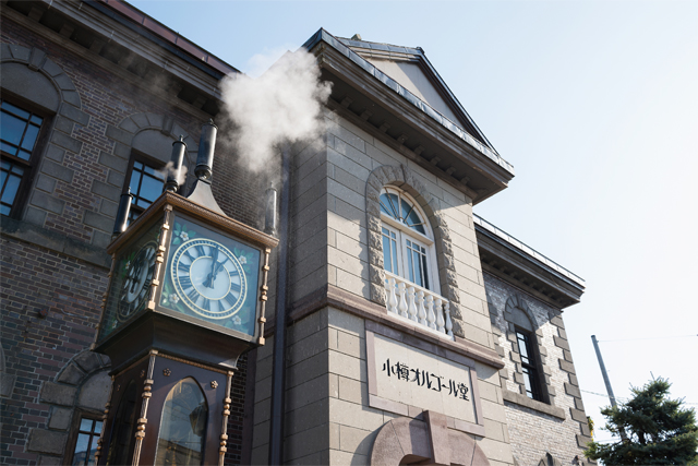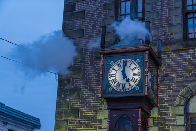 オルゴール堂の入り口には大きな時計があります。 カナダの時計職人によりバンクーバーの「ガストタウン」に作られたものと同型の蒸気時計は、 高さ5.5m、幅1m、重さ1.5トンのブロンズ製です。 時計はコンピュータ制御によりボイラーの蒸気を発生させ1時間毎に時刻を知らせるほか、 15分毎に蒸気で5音階のメロディーを奏でます。 レトロな雰囲気にぴったりと合った時計は地元民から観光客へ、毎日、時間を知らせています。