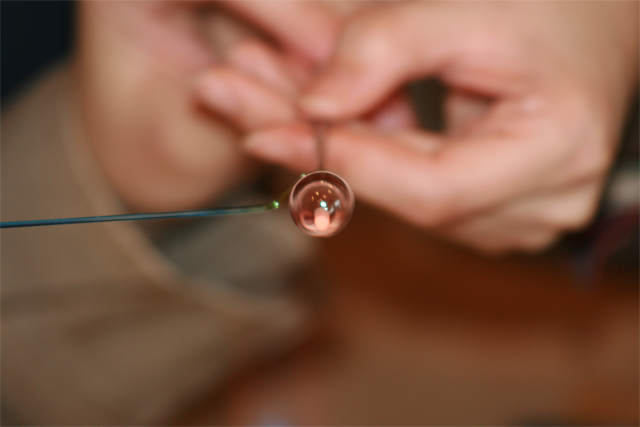 せっかく作ったのだから、その場で持ち帰りたいという方はトンボ玉づくりはいかがでしょうか。 好きな色のガラス棒を選び、ガスバーナーで溶かして鉄芯という棒に巻き付けまるい形に整えます。 熱々に熱したガラスに息を吹き、空気を入れます。 その後、模様を付けてかわいらしいトンボ玉にしていき、冷ましたら出来上がりです。 冷ますのに約60分程度かかりますので、観光して戻ってくるとちょうどよいかもしれません。 できたトンボ玉を使って、ストラップやヘアゴム、ネックレスなどのアクセサリーにアレンジをすることもできますので、 オリジナルのアイテムを常に身に着けることができます。