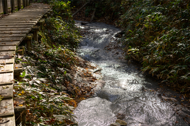 ゆで卵のような匂いが特徴の乳白色の湯で、