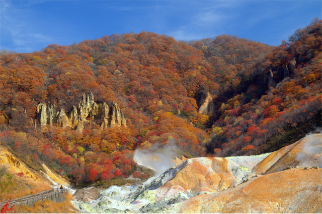 日和山の噴火活動によりできた火口跡。 直径は約450m、面積は約11ha。谷に沿って数多くの湧出口や噴気孔があり、 湯や蒸気がぐつぐつと湧く様子がまるで地獄のようだということで「地獄谷」と呼ばれるようになりました。 遊歩道が整備されており、間近で迫力ある景色を楽しむことができます。 地獄谷は登別温泉の源泉で、1日約1万トン湧出している多種類の湯が 温泉街のホテルや旅館に供給されています。